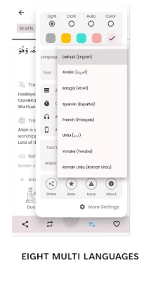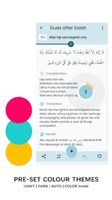 Mukauta sovelluksen ilmettä yli kahdenkymmenen väriteeman valikoimasta luodaksesi juuri omaan makuusi sopivan ympäristön. Asetuksista löydät monipuolisia toimintoja, jotka on suunniteltu parantamaan käyttökokemustasi entisestään. Kotivalikossa on lisäominaisuutena Tasbeeh-laskuri, joka sisältää valmiiksi kaksitoista keskeistä Dhikr-lausetta. Ainutlaatuinen mahdollisuus lisätä omia duas-rukouksia millä tahansa kielellä, joka ei vielä kuulu sovelluksen valmiiseen valikoimaan, tekee tästä työkalusta todella henkilökohtaisen ja joustavan kumppanin. Sovelluksen kehittäjät ovat sitoutuneet aitouteen ja tarkkuuteen, pyrkien jatkuvasti parantamaan ja varmistamaan sisällön oikeellisuuden tulevissa päivityksissä.