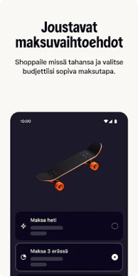 Tee ostoksista sujuvampaa ja hallitumpaa Klarnan avulla. Tämä sovellus tarjoaa sinulle vapauden päättää, milloin ja miten maksat ostoksesi – olipa kyseessä sitten välitön suoritus, myöhempi eräpäivä tai useampi koroton maksuerä. Klarnan avulla voit nauttia vaivattomasta ostoskokemuksesta suosikkikaupoissasi, sillä joustavat maksuratkaisut ovat aina ulottuvillasi, riippumatta siitä, missä teet ostoksia. Se on henkilökohtainen talousassistenttisi, joka mukautuu elämäntyyliisi ja auttaa sinua hallitsemaan menoja fiksusti ja stressittömästi.