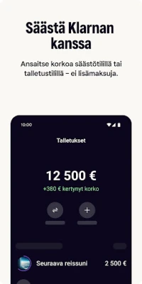 Klarna palkitsee myös uskollisuutesi. Ansaitse jopa 10 % cashbackia sadoista Klarnan kumppanikaupoista ja muuta nämä edut rahaksi suoraan Klarna-saldoosi. Laajenna maksun mahdollisuuksia entisestään Klarna-kortilla, jolla voit maksaa missä tahansa Visa hyväksytään. Päätä itse, maksatko heti vai myöhemmin – ja voit luoda maksusuunnitelmia ilman huolta luottotietojesi heikkenemisestä. Lisäksi voit kasvattaa varallisuuttasi Klarnan joustavilla ja määräaikaisilla säästötileillä, jotka tarjoavat kilpailukykyistä korkoa ilman kuukausittaisia lisämaksuja. Hallinnoi kaikkia varojasi ja saat palautukset vaivattomasti suoraan Klarna-sovelluksen kautta.