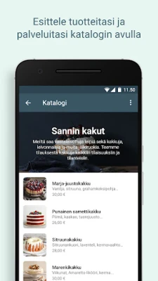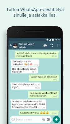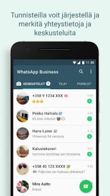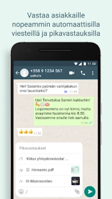Tehosta ajankäyttöäsi ja varmista, ettei yksikään asiakaskontakti jää hyödyntämättä. WhatsApp Business mahdollistaa älykkäät automaattivastaukset ja poissaoloviestit, jotta asiakkaasi saavat aina oikea-aikaista tietoa. Järjestä keskustelut vaivattomasti käyttämällä selkeitä tunnisteita, jotka nopeuttavat tärkeiden tietojen löytämistä. Esittele tarjouksiasi tai yrityksesi tuoreimpia uutisia kätevästi tila-ominaisuuden kautta ja hyödynnä mahdollisuutta vastaanottaa tilauksia ja maksuja suoraan sovelluksen kautta**, tarjoten näin asiakkaillesi sujuvan ja miellyttävän kokemuksen. Voit myös käyttää henkilökohtaista WhatsApp-tiliäsi ja yritystiliäsi samalla laitteella, mikäli sinulla on kaksi eri puhelinnumeroa.