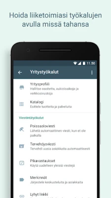 WhatsApp Business on ilmainen sovellus yrityksille. Sen sisäänrakennetut työkalut auttavat sinua tehostamaan työskentelyä, lisäämään asiakasluottamusta ja kasvattamaan liiketoimintaasi. Hyödynnä automaattisia vastauksia ja järjestelyominaisuuksia virtaviivaistaaksesi asiakasviestintääsi tehokkaasti.